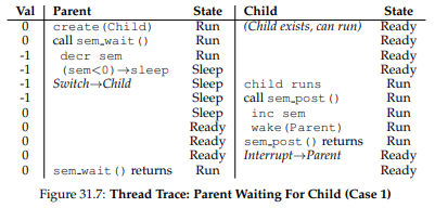 초기값 1 -> sem_wait() 를 통해 lock을 얻고 value가 0으로 감소 -> critical section 진입 -> 일을 다 끝내지 못하고 Interrupt 가 걸림, Thread 1으로 Context Switching (Run->Ready) -> Thread 1 실행 -> sem_wait()을 통해 lock을 얻으려고 했지만 감소를 했더니 negative number가 됐다. (0 -> -1) -> 따라서 Semaphore Waiting Queue에 Thread1을 등록시키고 Thread 1은 sleep 하게 된다. (Run->Sleep) 다시 T0로 Context Switching -> critical section 이어서 진행, 이 과정은 mutual exclusive 하게 진행 됐다. (Thread 1에서 critical section 에 진입을 하지 못했기 때문, 즉 sleep 했다) -> sem_post()를 통해 unlock을 해서 value를 증가시키고 기다리고 있는 T1 Thread를 깨운다. (Waiting Queue에서 제거하고 Ready Queue로 옮긴다, 따라서 Thread1은 Sleep->Ready) -> Interrupt 발생, T1으로 Switching -> wait() return 하는데 이 때 semaphore value를 얻었고 critical section으로 진입한다. -> sem_post()를 통해 unlock, value 증가 -> 끝.