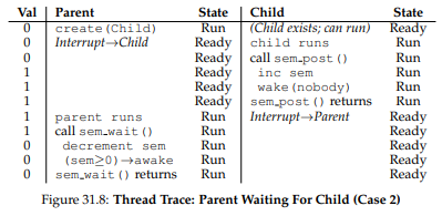 두 번째 케이스는 Parent에서 Child Thread를 create를 통해 생성하자마자 Interrupt가 걸려서 Child로 넘어가게 됐다. Child는 자기 할 일을 하고 끝났음을 알려주기 위해 sem_post() 를 호출해서 value를 increment 한다. (0 -> 1) 이어서 깨울 대상을 확인했지만 아무도 없어서 그냥 넘어간다. semaphore value만 증가시키고 끝. 이후 Interrupt가 발생해서 다시 Context Switching이 되면, Parent가 Run 하는데 우선 sem_wait()를 호출, semaphore value를 감소 시킨다. (1 -> 0) 하지만 방금 전 Child가 value를 증가 시켜 놓았기 때문에 감소를 해도 negative number로 떨어지지 않는다. 따라서 Sleep 상태로 들어가지 않는다. 그래서 Parent가 쭉 진행되면서 sem_wait()를 return 하고 Parent의 할 일을 한다.