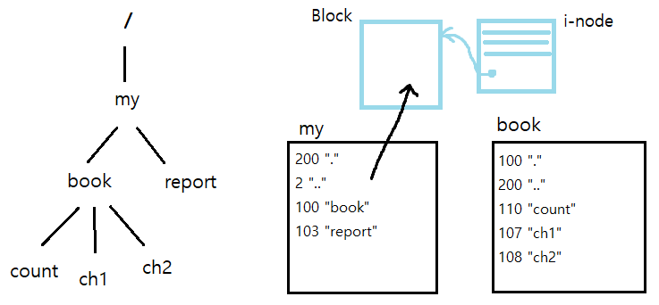 i-node는 각자 식별 번호를 가지고 있다. (ex: my는 200번, book은 100번 인 것 처럼)