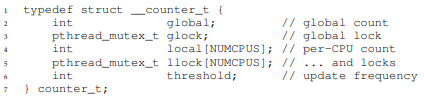 global count와 global lock이 존재하고 각 CPU(또는 각 Thread) 마다 local 하게 증가시키는 count가 존재한다.
