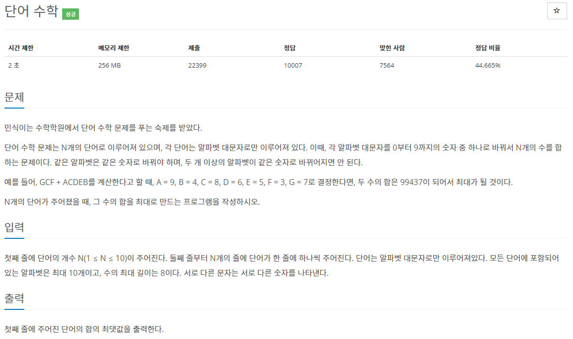 단어 수학은 주어진 알파벳들에 대하여 각각의 알파벳을 0 ~ 9의 숫자로 하나씩 대응 시켰을 때 그 합이 최대가 되도록 하는 문제이다.